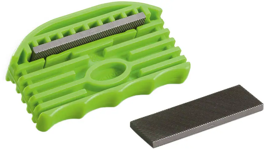 Voor precisie side edge vijlen. De hoeken die deze vijl biedt kunnen worden gebruikt voor de zijkant edges, wat de kant is die het meest bijgevijld moet worden (vergeleken met de basisrand). Deze edge tool met twee kanten biedt een keuze uit 0 (= 90°) of 2 (= 88°) graden rand. De grip is comfortabel en gemaakt met groeven voor je vingers voor een goede grip. Een extra vijl is inbegrepen.