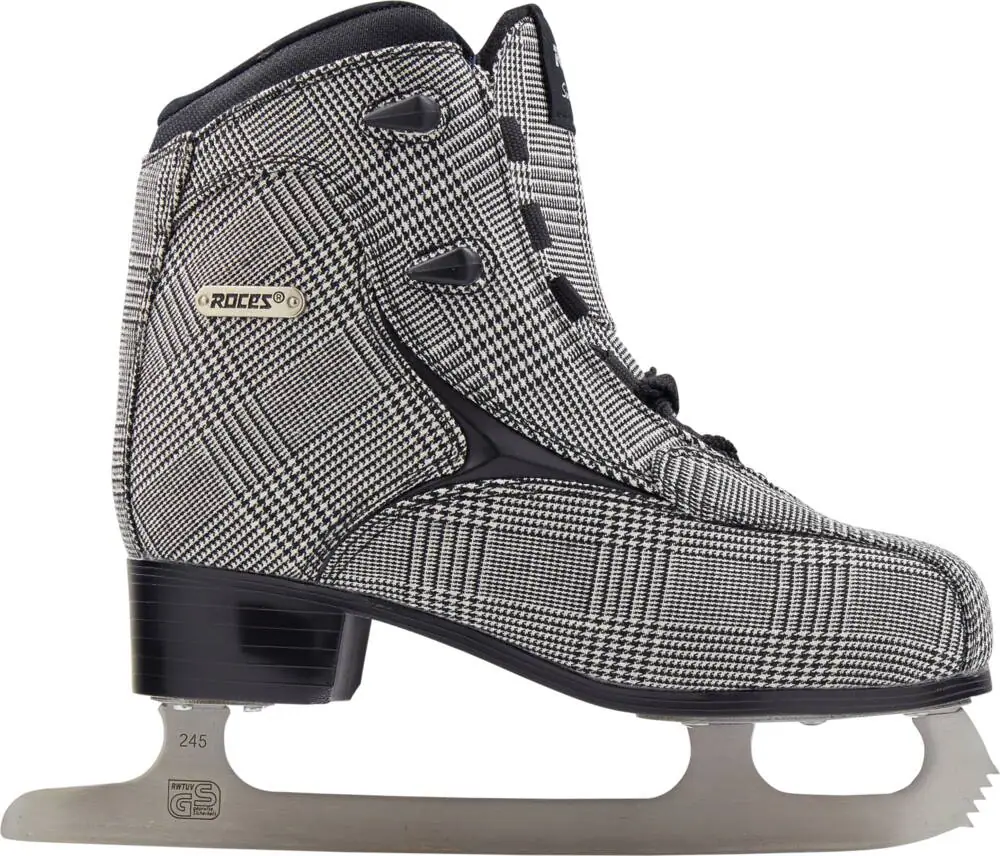 De Brits kunstschaats heeft een versterkte synthetische bovenkant gemonteerd op een anatomisch gevormd voetbed. De vetersluiting is snel en precies, zodat je elke keer een persoonlijke pasvorm krijgt. Ze hebben een coole grijze look met een geruit patroon.
